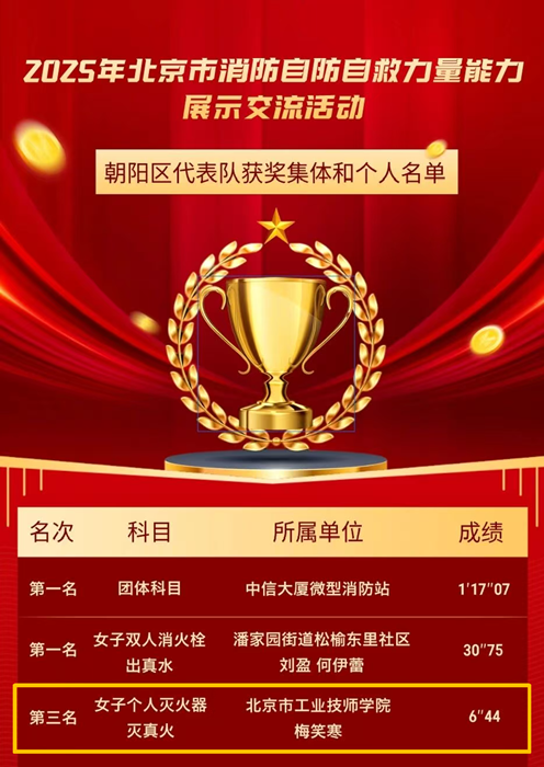 11月上旬,技師學(xué)院教師梅笑寒代表朝陽區(qū)參加北京市2025年消防自防自救力量能力展示交流活動,在“女子個人滅火器滅真火”項(xiàng)目中榮獲北京市第三名。此次交流活動,來自全市20支代表隊(duì)、600名消防安全重點(diǎn)單位、社區(qū)(村)自防自救力量隊(duì)員同場競技。