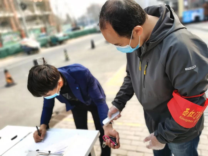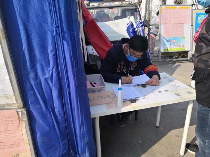 還有一件事我很驕傲。在工作中,我發現工作人員檢查證件時全都集中在卡口前,再加上村口人員嘈雜,使檢查工作既降低了效率,又容易造成人員聚集,于是我提議,檢查證件和測量體溫這兩項工作分別由兩位同事進行,在卡口處檢查證件,進入帳篷后由另一位同事對村民們進行體溫測量,這樣做提高了人員通過效率,也避免了村口人員聚集。