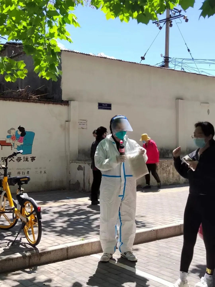 維持檢測秩序、進行現場消殺、撕拆采樣拭子、協助拆裝門磁……在做好個人防護的同時,我在盡力做著自己能做的一切。天冷的時候給同伴遞上擋風的棉衣;酷暑時,為醫護人員送上降溫的冰水;遇到人們的各種不滿和誤解的時候,也嘗試著從他們的角度去解釋、溝通??吹绞煜さ拿婵渍{侃幾句;遇到幼小的孩童,兼起看護的職責。每天中午,草草地吃完午飯,放棄午休的機會,去替換年輕的社工和志愿者,爭取讓他們多休息一會兒,好養精蓄銳、下午繼續更艱苦的戰斗。要不是眼睛有點兒見花,怕影響操作速度,我甚至想過去跟社區書記爭取機會,像年輕人那樣,穿上隔離服去錄入身份信息……