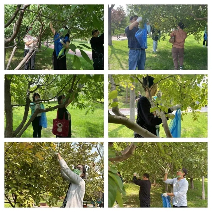 此次活動內容為樹木疏果,顧名思義,疏果就是疏除多余的果實,最大限度減少樹體的無效養分消耗,集中營養。通過疏果,可調節樹體健壯。工作內容雖然簡單,但大家仍然認真聆聽公園工作人員對此次活動內容的講解,絲毫沒有怠慢的想法?;顒又写蠹覠崆楦邼q,自動分組,有人負責海棠樹有人負責桃樹,一切井然有序。