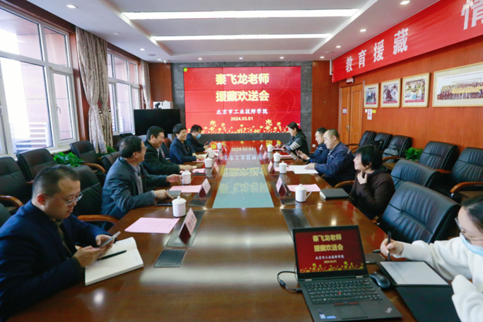 在啟程前,技師學院舉行秦飛龍老師援藏歡送會。北京化工集團黨委常委、組織部部長劉士義代表集團黨委歡送秦飛龍老師。技師學院有關領導、相關部室和專業系負責人參加歡送座談。