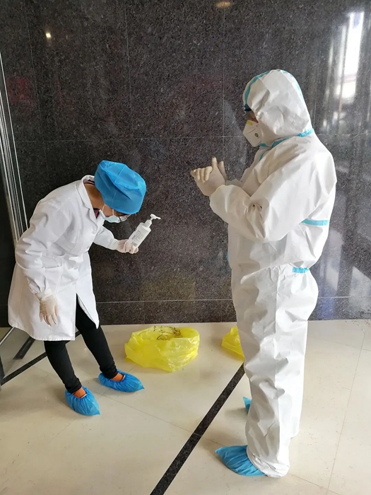 “我是黨員,我先來”,時間緊任務急,作為一名黨員率先垂范,周麗麗勇敢地接下送餐和垃圾收納任務。為確保完成一日三次的送餐和垃圾收納工作,周麗麗每次都要全副武裝穿上防護服,并嚴格按照要求進行消殺。俗話說隔行如隔山,從未接觸過防護服,其穿脫過程異常艱難,但周麗麗不怕麻煩。為了防止交叉感染,隔離區(qū)域的電梯停止使用,每次賓館人員送餐都要爬樓梯將餐飲搬到樓梯間,然后由全副武裝的周麗麗徒步一個房間一個房間地配送。送餐完畢,還要一個房間一個房間地收納垃圾。由于防護服不透氣,剛一行動起來,周麗麗已經(jīng)渾身是汗,但是她沒有退縮,每次都保質保量按時完成了任務。在數(shù)日的時間里多次進入隔離區(qū),圓滿地完成了任務,真正做到了關鍵時刻站得出來,危急時刻豁得出來。