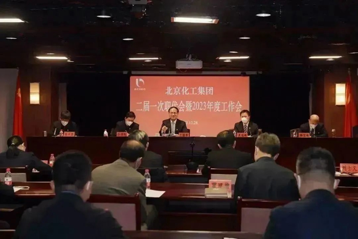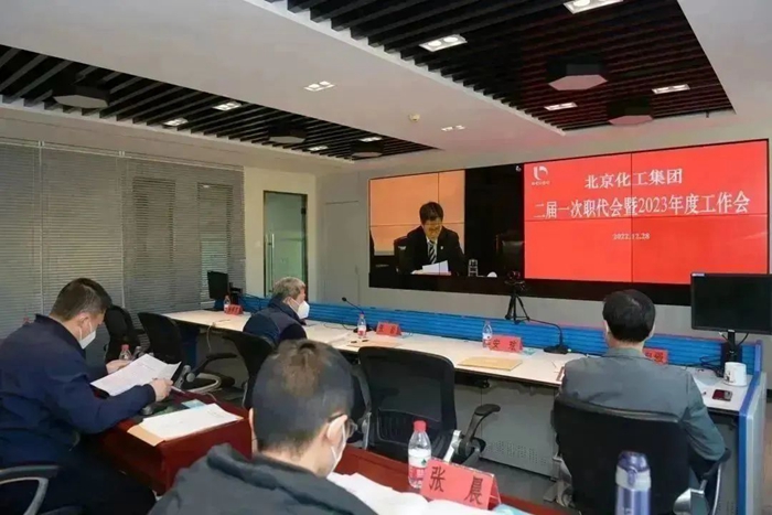 北京化工集團二屆一次職代會暨2023年度工作會于12月28日召開,會議深入學習貫徹黨的二十大、中央經濟工作會議及市委十三屆二次全會精神,總結2022年工作,研究部署2023年任務,黨委書記、董事長王國華作總結講話,黨委副書記、工會主席吳瑞峰主持會議,集團外部董事,領導班子成員及高管人員出席會議;總部正、副部長,高級專家、專家、專職董監事,各二級單位領導班子成員和職工代表170余人參加會議。