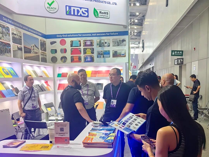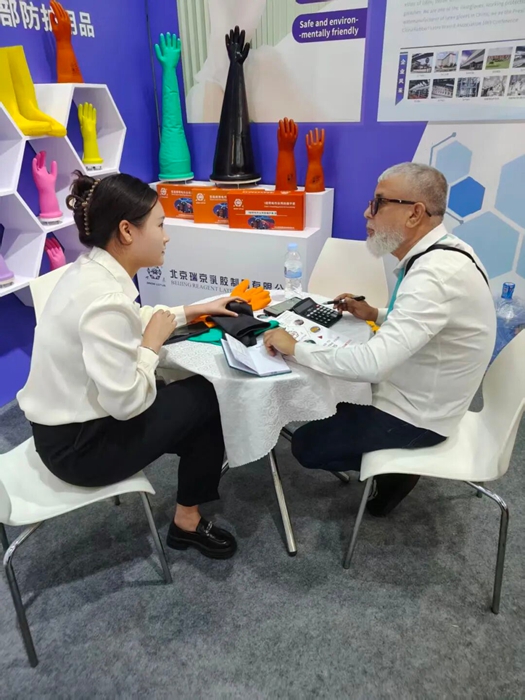 在本屆廣交會(huì)第一期,華騰橡塑與瑞京公司聯(lián)袂登場(chǎng),其中華騰橡塑重點(diǎn)展示了公司創(chuàng)新研發(fā)的濕法混煉天然膠膠板產(chǎn)品;瑞京公司則帶來(lái)了“雪蓮”牌專業(yè)工業(yè)用手套系列產(chǎn)品,吸引了眾多國(guó)際客戶駐足交流,現(xiàn)場(chǎng)與部分客戶達(dá)成初步合作意向并計(jì)劃寄送樣品,為后續(xù)深入合作打下良好基礎(chǔ)。